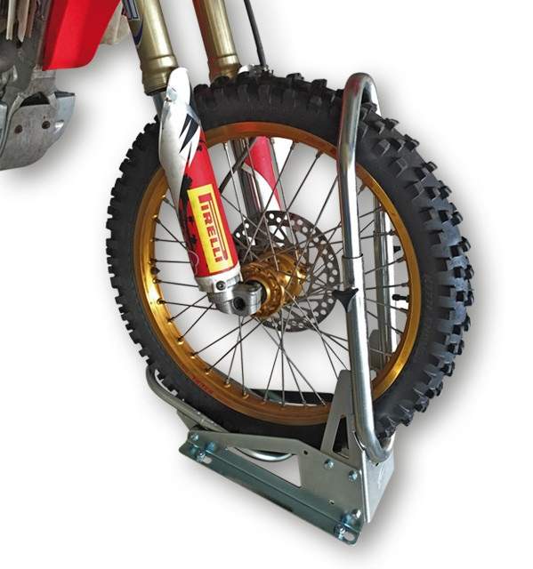 Transportní zařízení SteadyStand® Cross Basic - držák předního kola velikosti 18"-21" palců a šíře 90-120 mm, Speciálně vyvinutý pro motocykly MX Cross,Enduro a Dirt. Přední kolo lze snadno a jednoduše ukotvit ke stojanu a není potřeba stahovat přední vidlice, čímž předejdete opotřebení nebo poškození gufer.