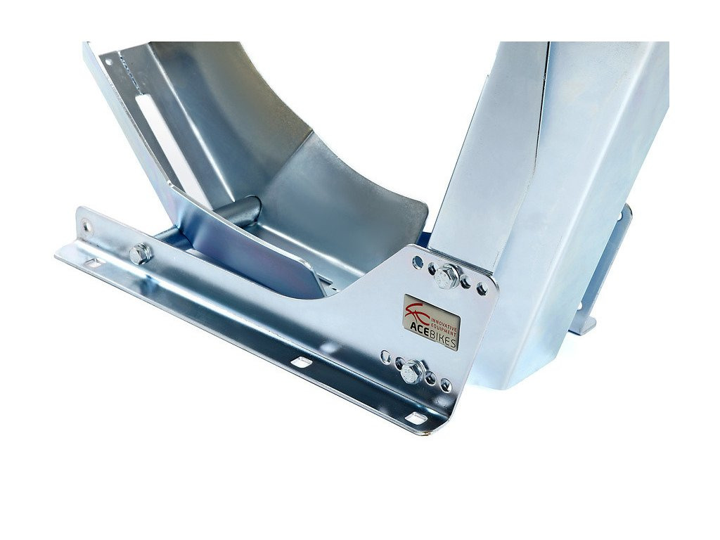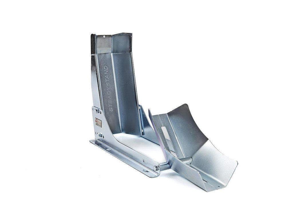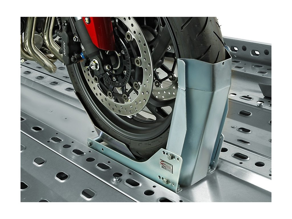 ACEBIKES SteadyStand® Fixed stavitelné transportní zařízení - držák předního kola 10"-19" palců. SteadyStand Fixed lze snadno namontovat na podlahu přívěsu nebo dodávky. Váha udržuje motocykl pevně ukotvený, stačí dát popruhy na motocykl pro úplnou bezpečnost uchycení. SteadyStand Fixed je nastavitelný pro různé velikosti kol, vhodný pro pneumatiky od 10 do 19 palců s šířkou pneumatiky 90 mm až 130 mm.