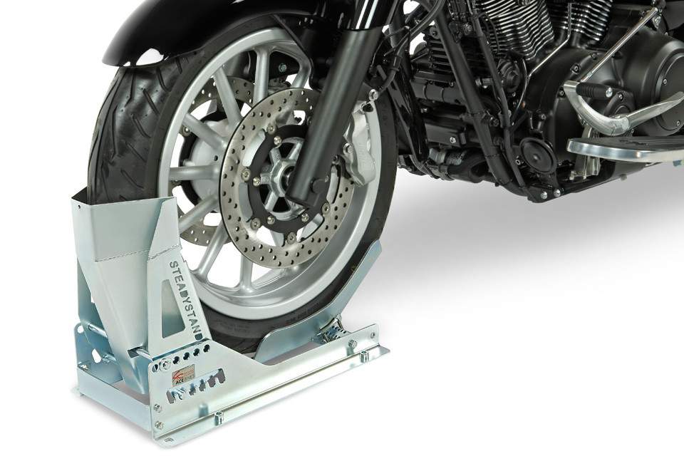 SteadyStand Multi Fixed lze snadno namontovat na podlahu přívěsu nebo dodávky. Svým motocyklem můžete zajet do SteadyStand Multi Fixed a postavit ho ve svislé poloze. Hmotnost zajišťuje, že váš motocykl zůstává pevně ukotven. Zbývá jediná věc, ukotvit motocykl popruhy, aby byla zajištěna jeho bezpečnost. SteadyStand Multi Fixed je chytře navržen tak, aby jej bylo možné upravit bez použití nářadí. Tento snadno nastavitelný systém je perfektní, pokud vlastníte více než jednu motorku nebo pokud chcete přepínat mezi přední a zadní pneumatikou. Steady Stand Multi Fixed je vhodný pro kola od 15 do 21 palců a šířky pneumatik od 90 do 200 mm.