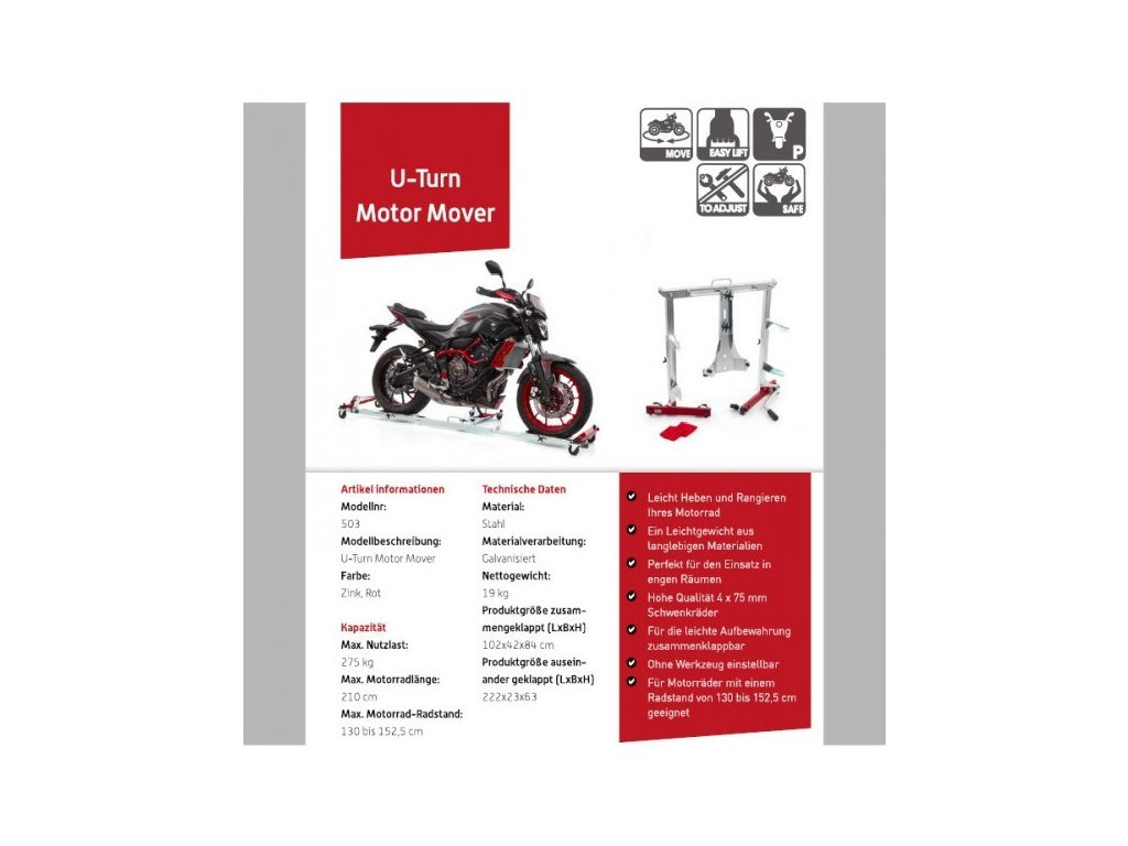 ACEBIKES U-Turn manévrovací stojan do dílny nebo garáže. Acebikes U-Turn universální manévrovací stojan vám pomůže snadno zvednout celý motocykl a zjednodušit tak manévrování na malém prostoru Vaší dílny nebo garáže. U-turn ACEBIKES je plně nastavitelný a proto se snadno přizpůsobí velikosti vašeho motocyklu bez použití nářadí.