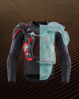 Airbag systém, který ochránní ramena, hruď, záda, torzo, klíční kosti, krk společně s pasivní ochranou zad, hrudi, torza, loktů a ramen díky CE certifikovaných prvků tělového protektoru.