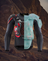 Airbag systém, který ochránní ramena, hruď, záda, torzo, klíční kosti, krk společně s pasivní ochranou zad, hrudi, torza, loktů a ramen díky CE certifikovaných prvků tělového protektoru.