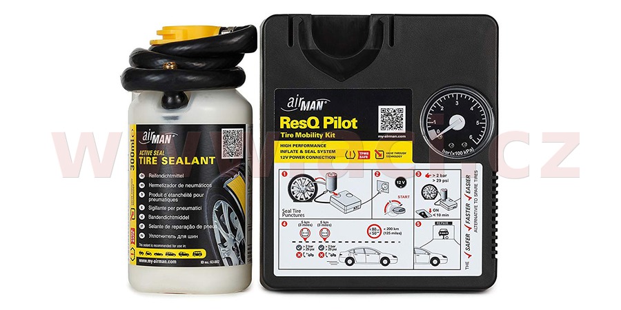 Se systémem AirMan můžete pokračovat ve své cestě i když dostanete defekt. Kompresor a těsnící hmota efektivně utěsní nejčastější typické průrazy pneumatiky do 6 mm. Po nouzové opravě pneu můžete jet až 200 km maximální rychlostí 80 km/h - do nejbližšího pneuservisu. S dodanými adaptéry můžete hustit i nafukovací sportovní potřeby, pneumatiky bicyklu atd.