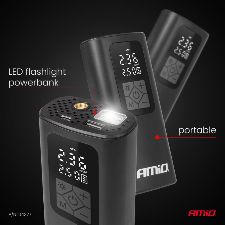Je vybaven digitálním LED displejem, na kterém můžete přesně nastavit a kontrolovat tlak. Vestavěná LED svítilna usnadní používání ve tmě a funkce powerbanky umožní nabíjet smartphone nebo jiné mobilní zařízení v případě potřeby.