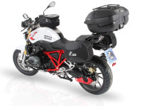 Boční brašny jsou upínané na držáky ve tvaru podkovy, nebo-li "C" a pomocí zámků zajištěny na motocyklu. Tím jsou chráněny proti odcizení, či ztrátě. Díky pevným držákům, nevlajou a neplandají, nehrozí posunutí a propálení od výfuku, nepřekáží spolujezdci.