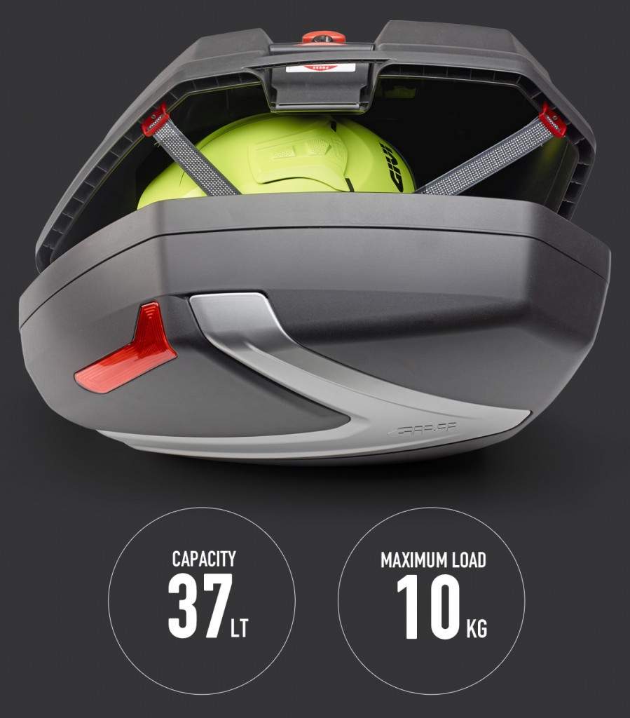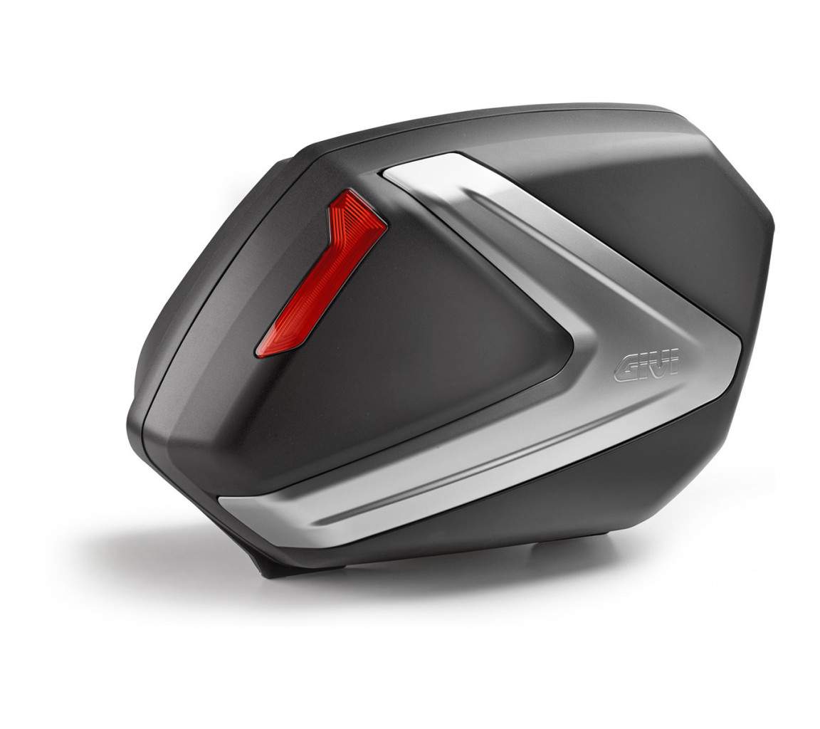 V 37N pár bočních kufrů GIVI (levý+pravý) - černé kufry s krytem ve tvaru šípu ve stříbrné barvě - červené odrazky