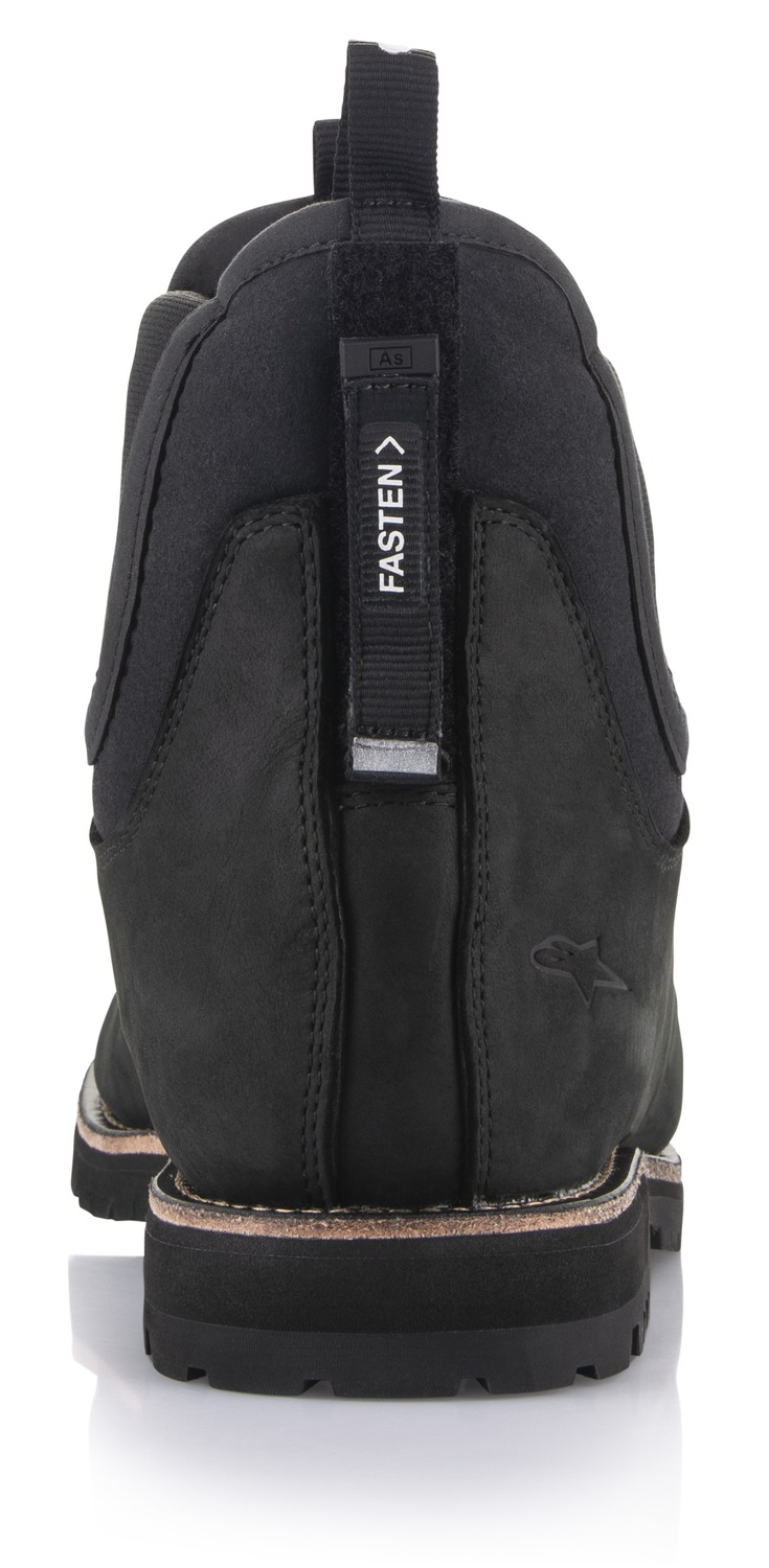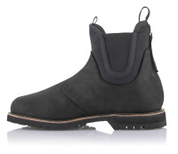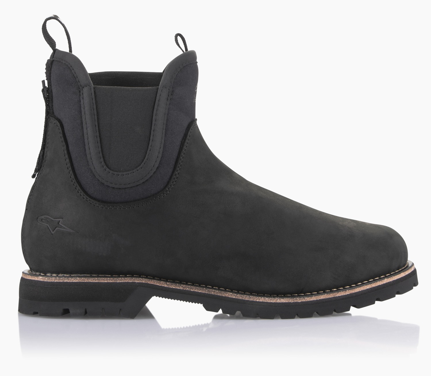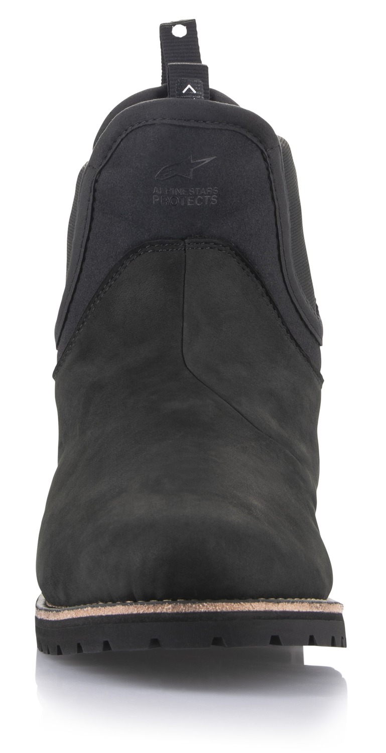 Klasická motorkářská bota s obšívkou z 1,5 mm tlusté hovězí kůže postavená na populárním stylu kožených kotníkových bot Chelsea, které se vyznačují vysokým komfortem díky streč panelům v oblasti kotníků. Aby bota při dané konstrukci s vrchní pružnou manžetou splňovala všechny aspekty ochranné motorkářské obuvi, tak v ALPINESTARS vyvinuli inovativní systém aretačního lanka, které je vedeno po okraji pružné manžety. Po nasazení boty jednoduše botu zafixujete zatažením předního a zadního poutka. Tím zajistíte, že je bota pružná a současně drží pevně na noze. Vhodné pro komfortní nošení bot nenápadně pod nohavicemi kalhot. Boty jsou CE certifikované.