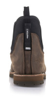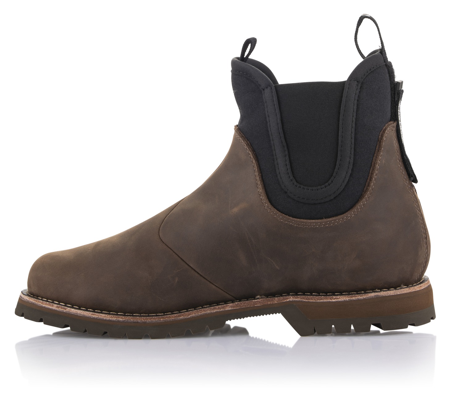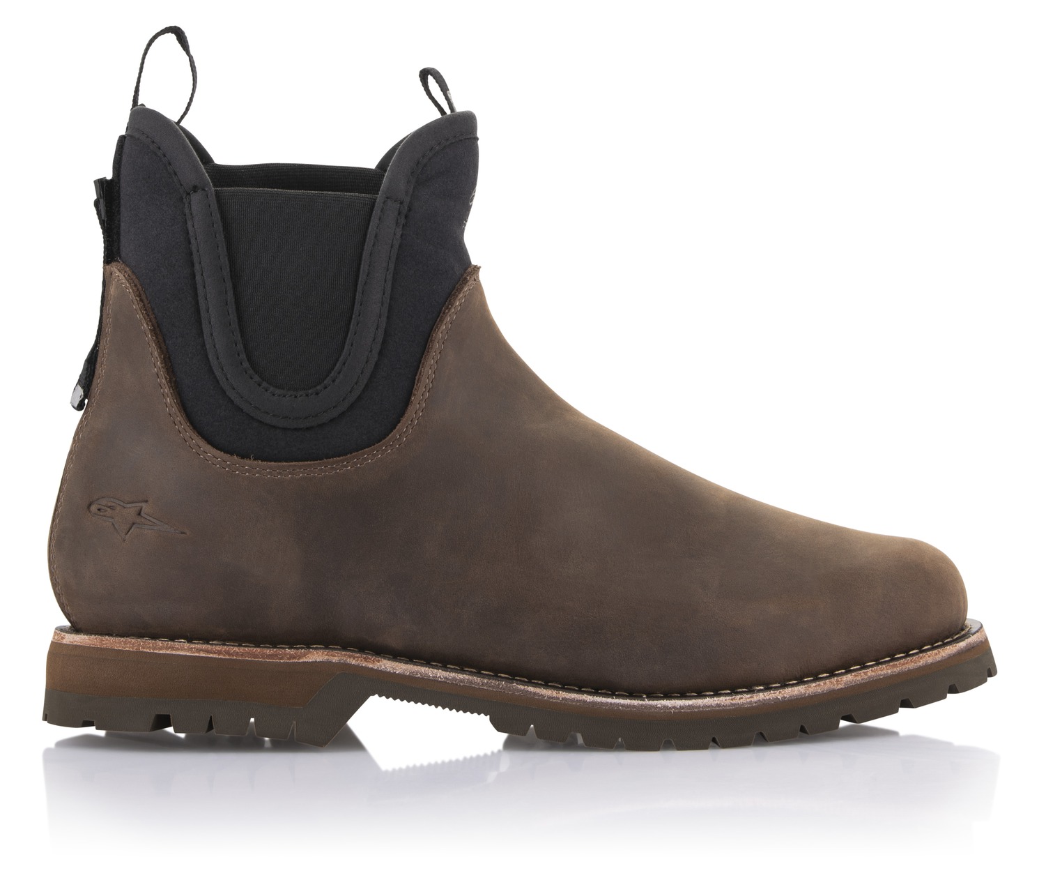 Klasická motorkářská bota s obšívkou z 1,5 mm tlusté hovězí kůže postavená na populárním stylu kožených kotníkových bot Chelsea, které se vyznačují vysokým komfortem díky streč panelům v oblasti kotníků. Aby bota při dané konstrukci s vrchní pružnou manžetou splňovala všechny aspekty ochranné motorkářské obuvi, tak v ALPINESTARS vyvinuli inovativní systém aretačního lanka, které je vedeno po okraji pružné manžety. Po nasazení boty jednoduše botu zafixujete zatažením předního a zadního poutka. Tím zajistíte, že je bota pružná a současně drží pevně na noze. Vhodné pro komfortní nošení bot nenápadně pod nohavicemi kalhot. Boty jsou CE certifikované.