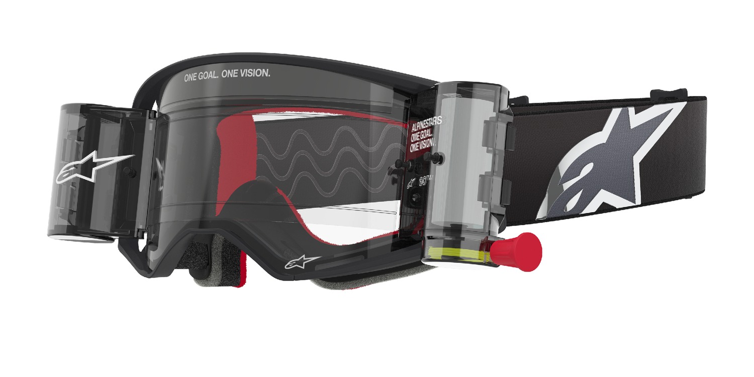 Provedení s ROLL-OFF systémem obsahuje specifické plexi, dvě cívky, stěrku a kryty systému ALPINESTARS ROLL-OFF WIDE VISION. Všechny plexi mají 100% UVA ochranu. Plexisklo systému ROLL-OFF obsahuje drážky pro vedení filmu lemované silikonovým těsněním. Úhel výhledu mezi krytkami systému ROLL-OFF WIDE VISION poskytuje více než 160 mm šírky, což je největší šířka na trhu s MX brýlemi.