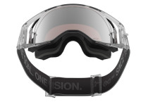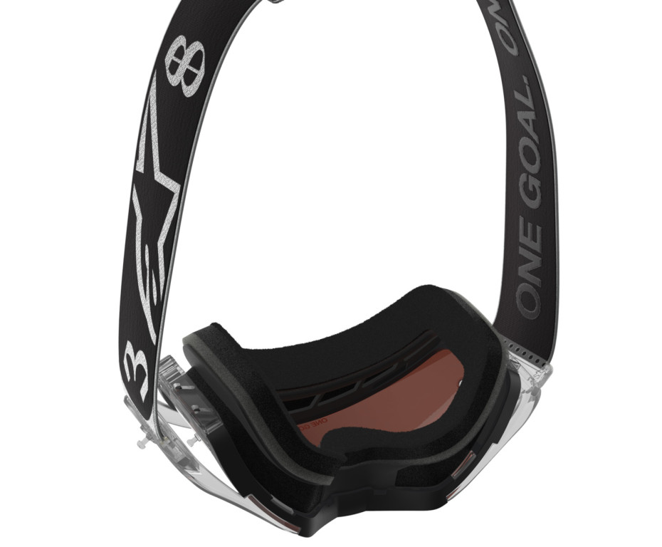 - Asymetrická pozice pásku brýlí tloušťky 45 mm s úhlem náklonu 13° zajišťuje rovnoměrné umístění brýlí na přilbě a okolo obličeje.