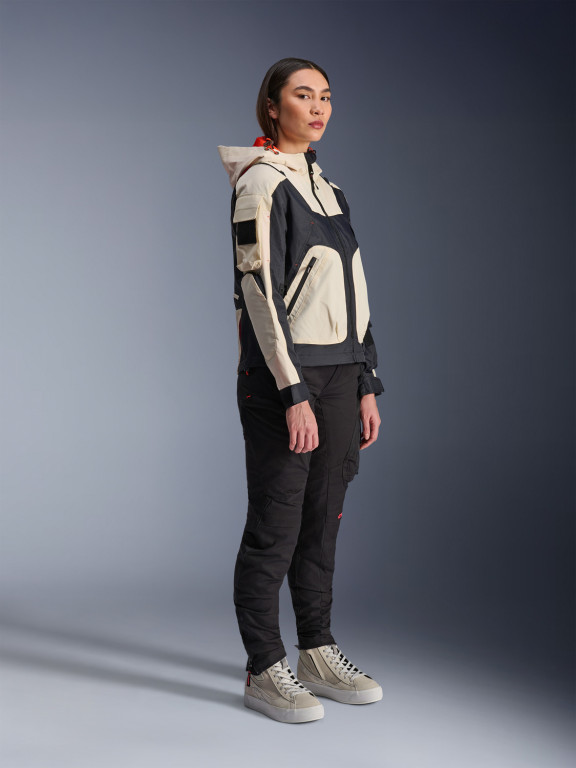 Lehká, nastavitelná a skladná kapuce posytuje ochranu před občasným, nečekaným deštěm zatímco patent pro její fixaci zabraňuje jejímu pohybu během jízdy na motocyklu. Pro zvýšení všestrannosti je možné kapuci sbalit a skrýt do zakladače v úrovni límce.