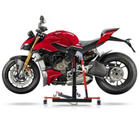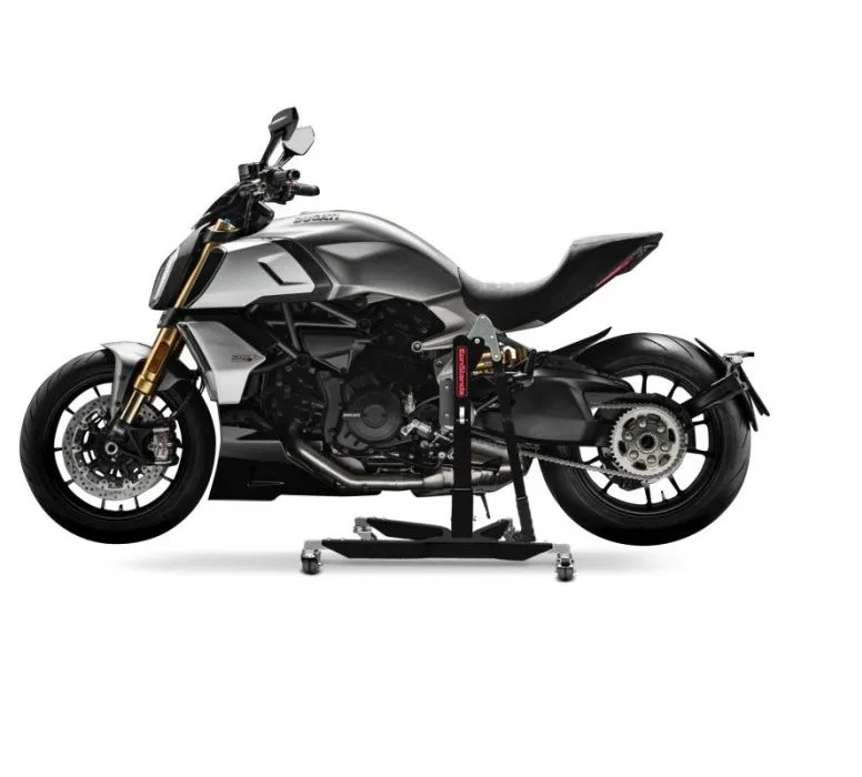 S centrálním stojanem ConStands Power-Classic lze celý motocykl bez námahy zvednout během několika sekund. Stabilní dvojitá kolečka vám umožní snadno manévrovat s motocyklem v nejužším prostoru a umístit jej s milimetrovou přesností. Pokud se stojan nepoužívá, lze jej uložit nebo přepravit, aby se ušetřilo místo díky integrované funkci skládání.
