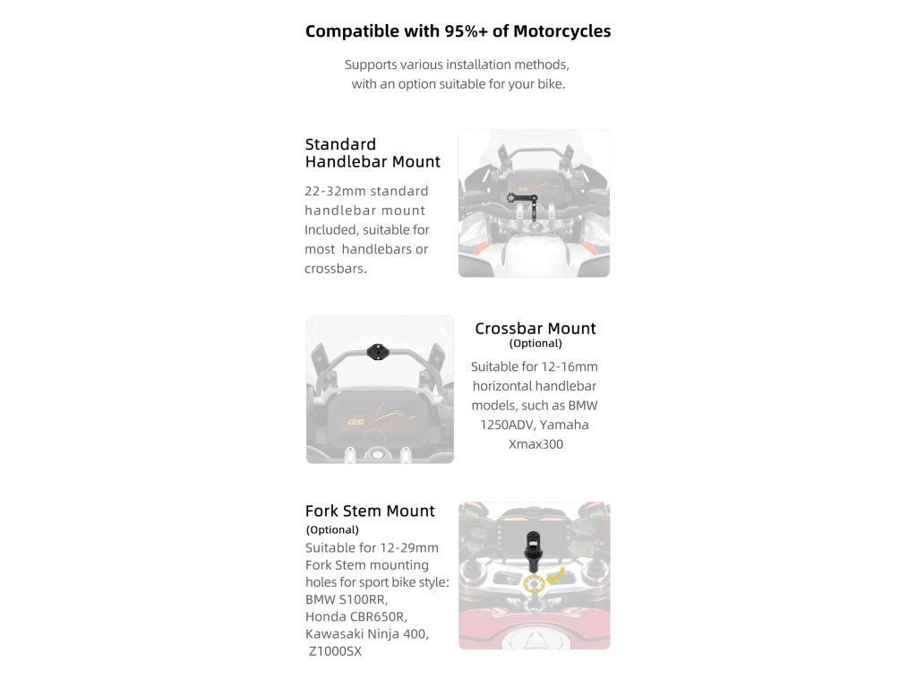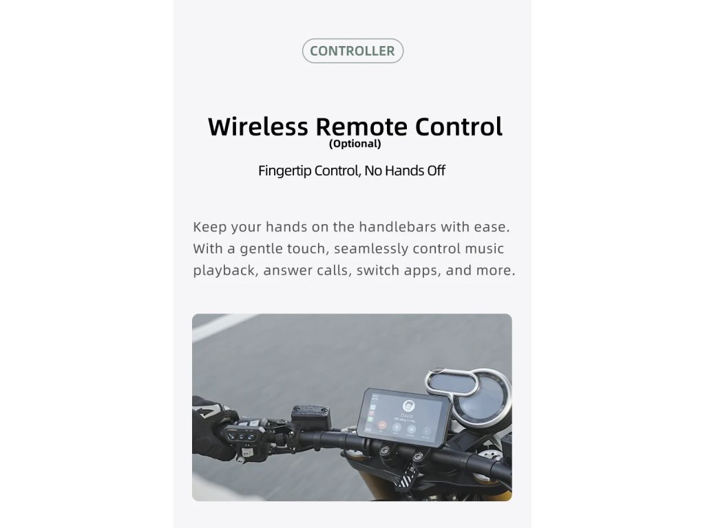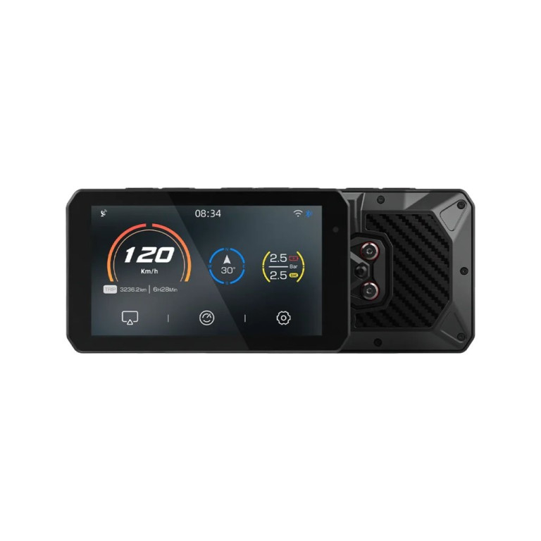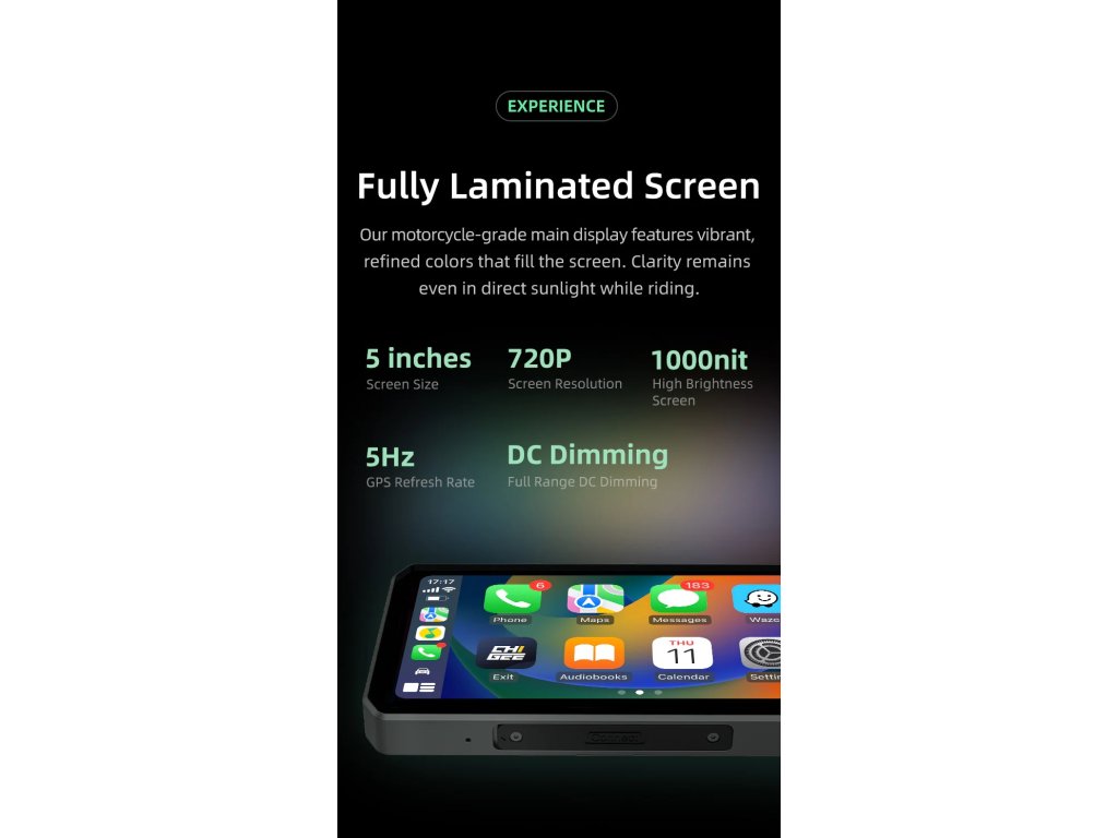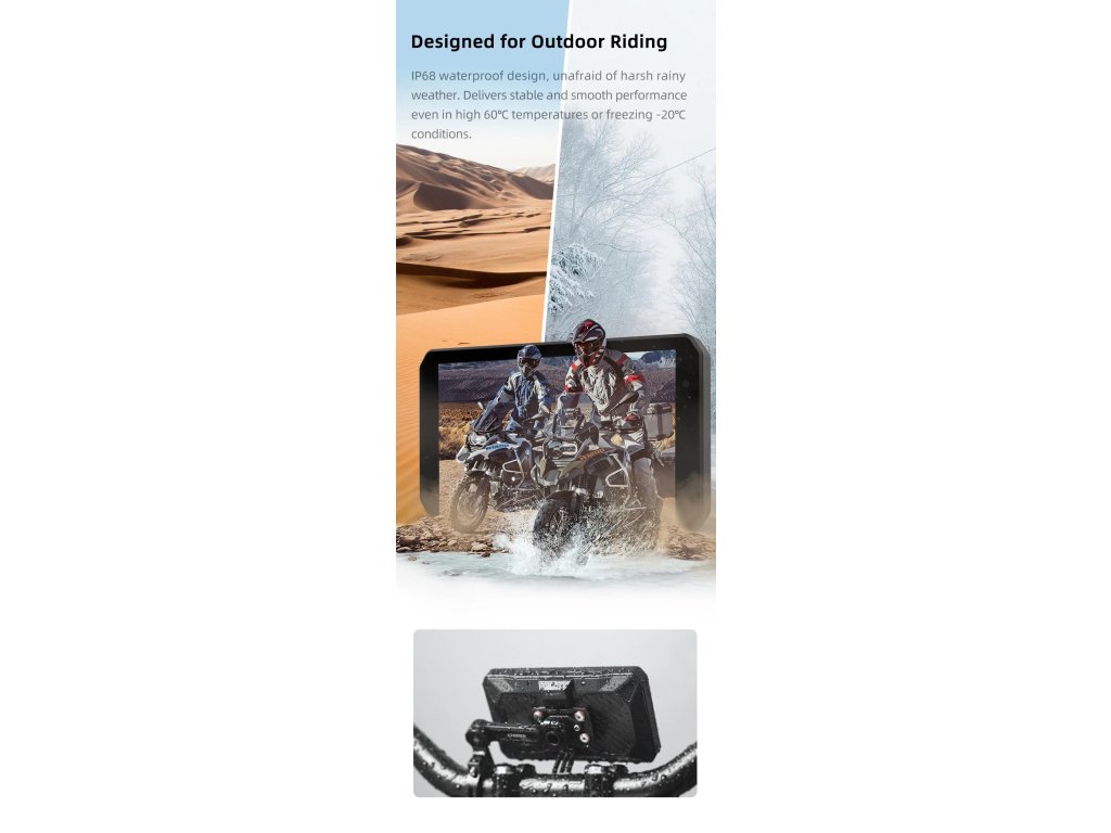 Bezdrátové zrcadlení smartphonu: Umožňuje přístup k navigaci, hudbě a hovorům během jízdy. Nabízí různé funkce Robustní a vodotěsný: Certifikace IP68, díky čemuž je prachotěsný a vodotěsný. Vyrobeno pro náročné podmínky, poskytuje spolehlivý výkon v různých povětrnostních podmínkách. Jasný a čirý displej: 5palcový displej nabízí vynikající viditelnost i na jasném slunci. Automatické nastavení jasu displeje. Bezdrátové aktualizace: Přijímejte a instalujte aktualizace softwaru bezdrátově