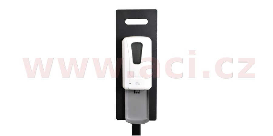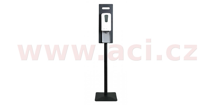 Mobilní bezdotykový dávkovač dezinfekce s robustním kovovým stojanem.
