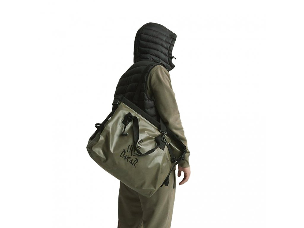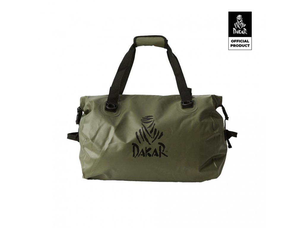 Khaki cestovní taška z oficiální dakarské kolekce s možností zvětšení úložného prostoru a logem Dakar na přední straně. Tašku lze nosit v ruce nebo pohodlně přes rameno díky popruhu s polstrováním.