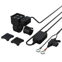 Držák s rychloupínací objímkou pro možnost osazení na trubky řídítek s integrovanou zásuvkou se standardem USB-C pro možnost připojení a napájení zařízení pomocí baterie motocyklu.
