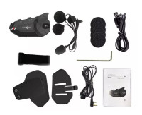 Bluetooth handsfree pro otevřené a uzavřené helmy s funkcí interkomu, přehrávačem hudby MP3 i 2K záznamovou kamerou s dosahem až 1000 metrů mezi uživateli.