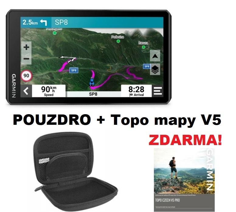 Předinstalované topografické mapy s 3D terénem a silniční mapy Evropy a Blízkého východu. Mapy Afriky (včetně tras Tracks4Africa), Severní a Jižní Ameriky, Austrálie a Nového Zélandu si stáhnete zdarma na garmin.com/express.