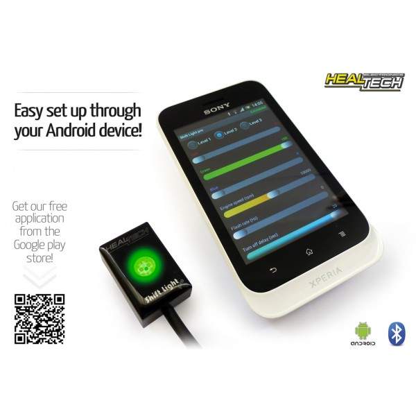• Plně nastavitelný indikátor přeřazení s vysoce svítivou SMD LED.• Snadné programování pomocí Android zařízení nebo PC pomocí Bluetooth připojení.• Nastavitelný počet blikání, délka, jas a barva pro 3 úrovně indikace otáček.