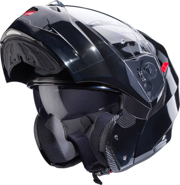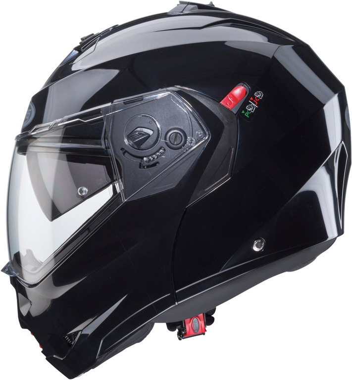 - P/J duální homologace pro otevřenou i integrální helmu garantující bezpečnou jízdu se zajištěnou otevřenou bradovou částí - díky P/J páčce na levé straně helmy lze pozici otevřené bradové části zamknout (pozice "J") a tím blokovat možnost jejího samovolného zavření za jízdy