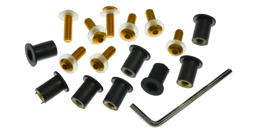 Inbusy pro plexi vč. matic M5 v pryžovém pouzdře a podložek, OXFORD (zlatý elox)