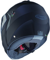 - P/J duální homologace pro otevřenou i integrální helmu garantující bezpečnou jízdu se zajištěnou otevřenou bradovou částí - díky P/J páčce na levé straně helmy lze pozici otevřené bradové části zamknout (pozice "J") a tím blokovat možnost jejího samovolného zavření za jízdy