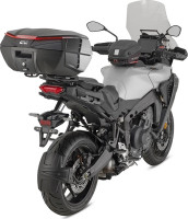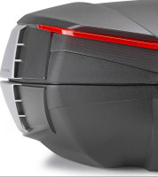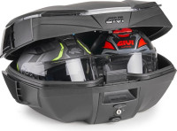 Velký horní kufr GIVI, objem 49 litrů, rozměry budou upřesněny, nosnost 10 kg, pro 2 přilby - lze doobjednat opěrku E235S-2, vnitřní textilní tašku T502B. Novinka 2025. Vybaven bočními "křidélky" Wingflow System, černě lakovanými.