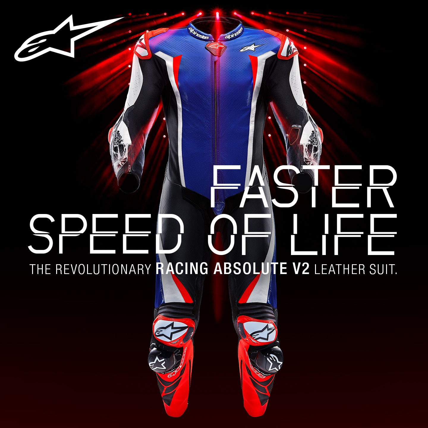 Kombinéza RACING ABSOLUTE druhé generace je nejvyšší řadou jednodílných kombinéz ALPINESTARS určených pro profesionální použití. Kombinéza disponuje nízkou hmotností, pokročilým materiálovým řešením a technologiemi, které jsou použité u kombinéz jezdců MotoGP a WSBK. Vedle použití lehké klokaní kůže společně se zdvojenými panely na místech na kterých je očekávaný potencionální kontakt s povrchem trati (lokty, předloktí, sedací část, boky a záda) kombinéza disponuje zesílením pomocí Kevlar® streč panelů v oblasti rozkroku, na vnitřních partiích rukávů a v podpaží. Pevně spojená vrstva Kevlar® síťoviny pod vrstvou kůže napomáhá zvýšené odolnosti proti prořezu, roztržení, oděru stejně tak jako výrazně snižuje teplotu v okolí jezdcova těla generovanou během případného tření při skluzu po asfaltu.