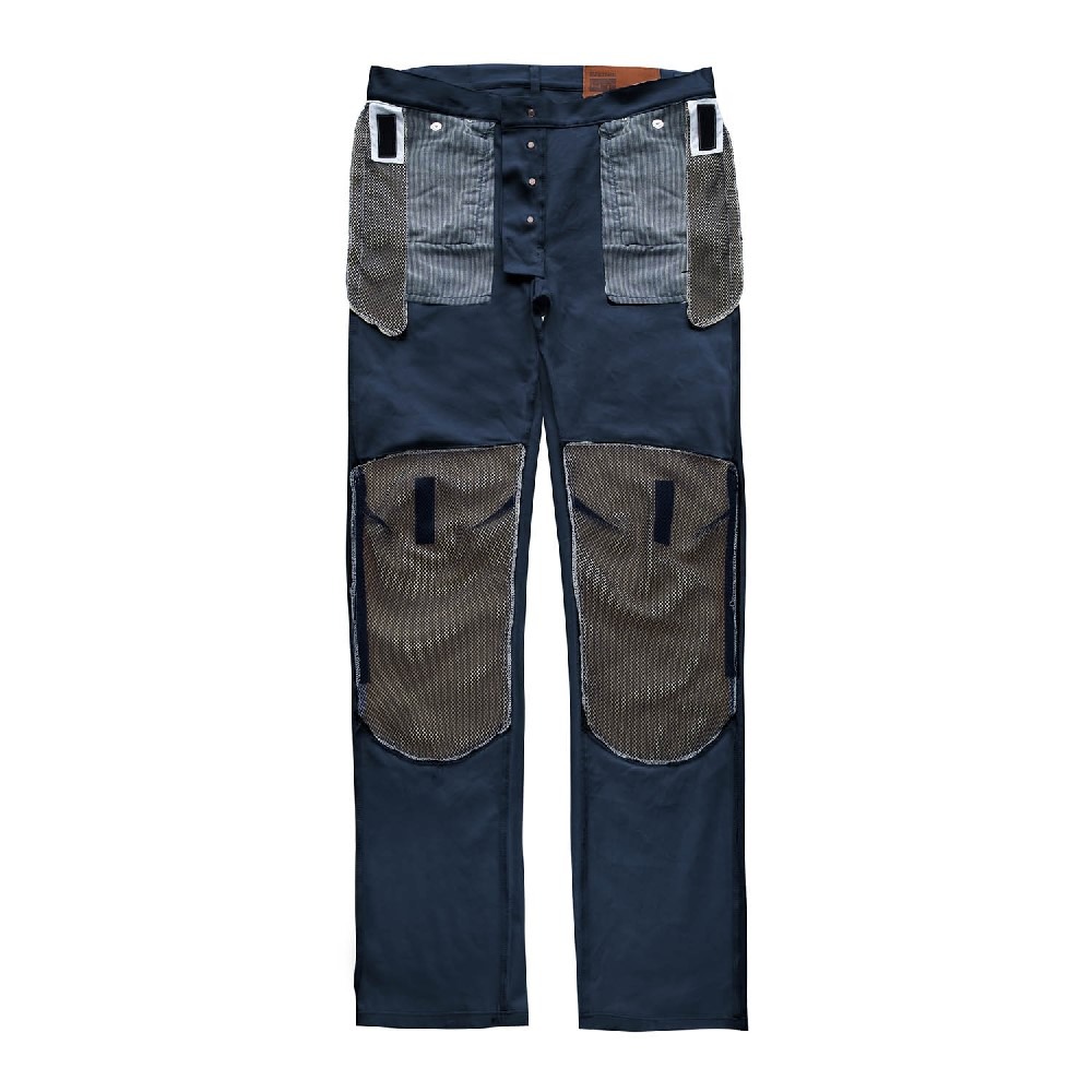 - Aramidové panely jsou strategicky umístěny na styčných plochách: boky, hýždě, kolena.