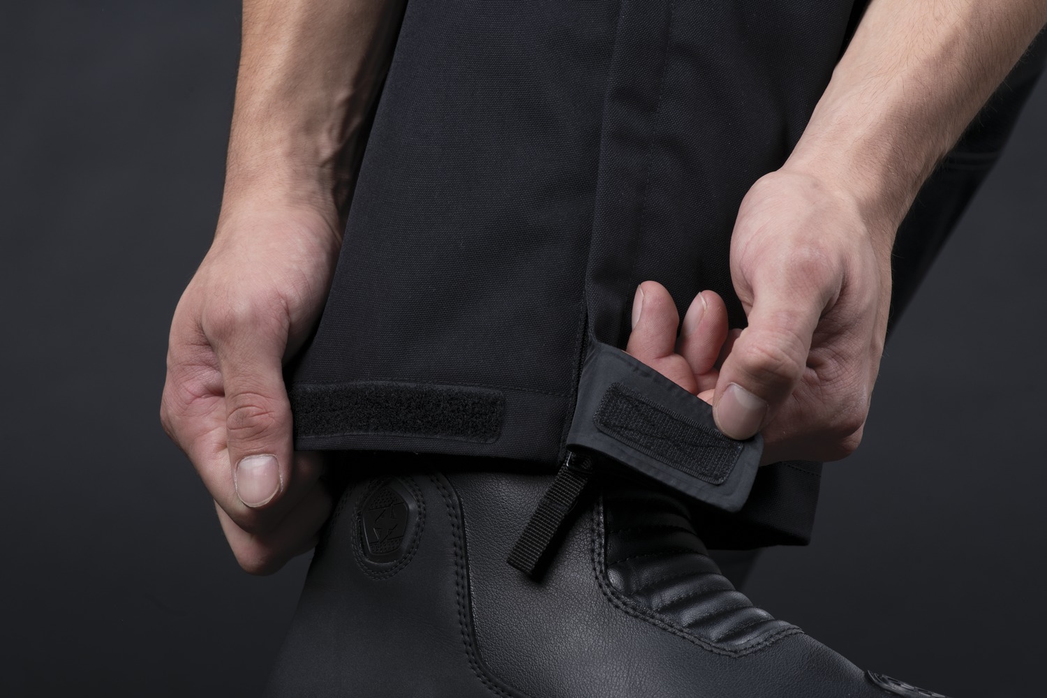Promyšlené konce nohavic s kompresními a nastavitelnými manžetami pro možnost umístění bot přes nebo pod nohavice.