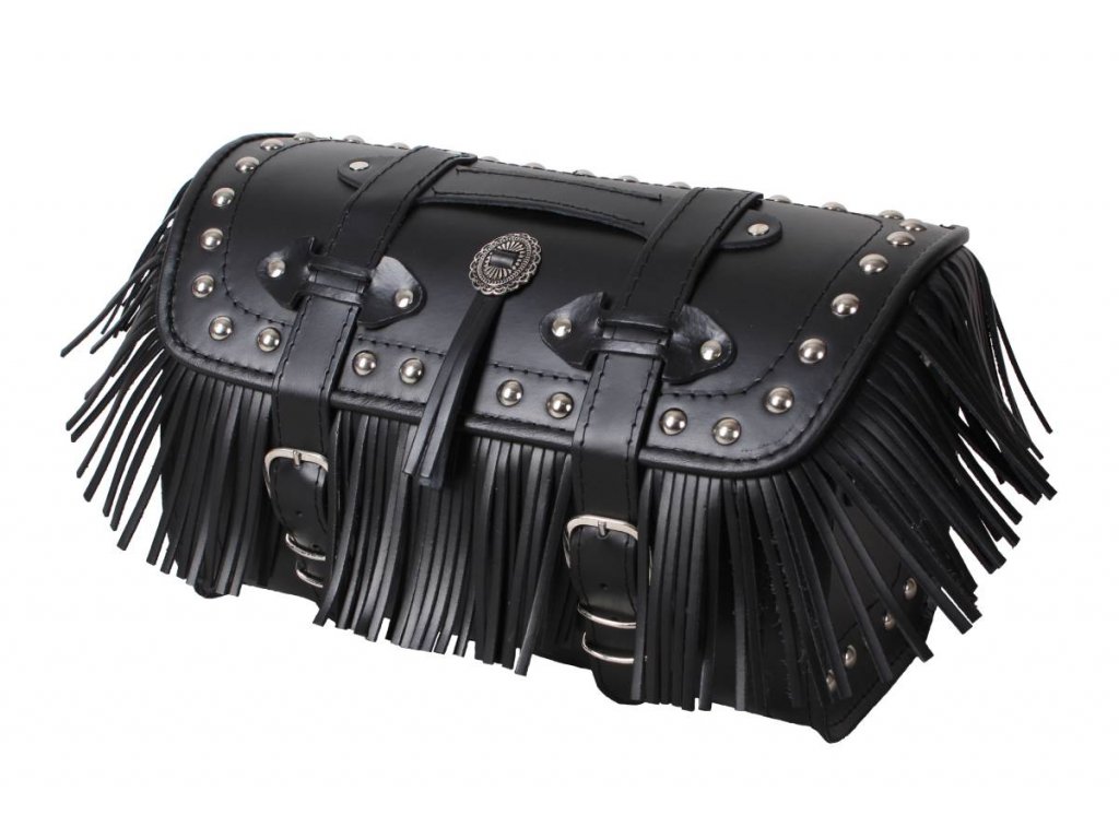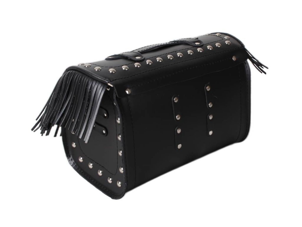Kožený moto kufr TXR TK4E s třásněmi černý je vyroben z hovězí kůže o tl. 2,8 - 3,2 mm opatřený vodoodpudivým povlakem. Víko kufru se zapíná pomocí dvou pásek. Vnitřní strany jsou vyztužené speciálním materiálem, díky kterému se kufr nedeformuje pod hmotností zavazadla a taktéž zajistí neměnný tvar kufru. Spodní část je vyztužena 8 mm HPL materiálem. Pro snadné přenášení je vrchní víko opatřeno madlem. K uchycení kufru k motocyklu jsou na zadní stěně a spodní části kufru poutka.