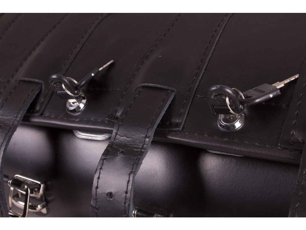 Kufr na motorku z hovězí kůže, tl. 2,8 - 3,2 mm opatřena vodoodpudivým povlakem.