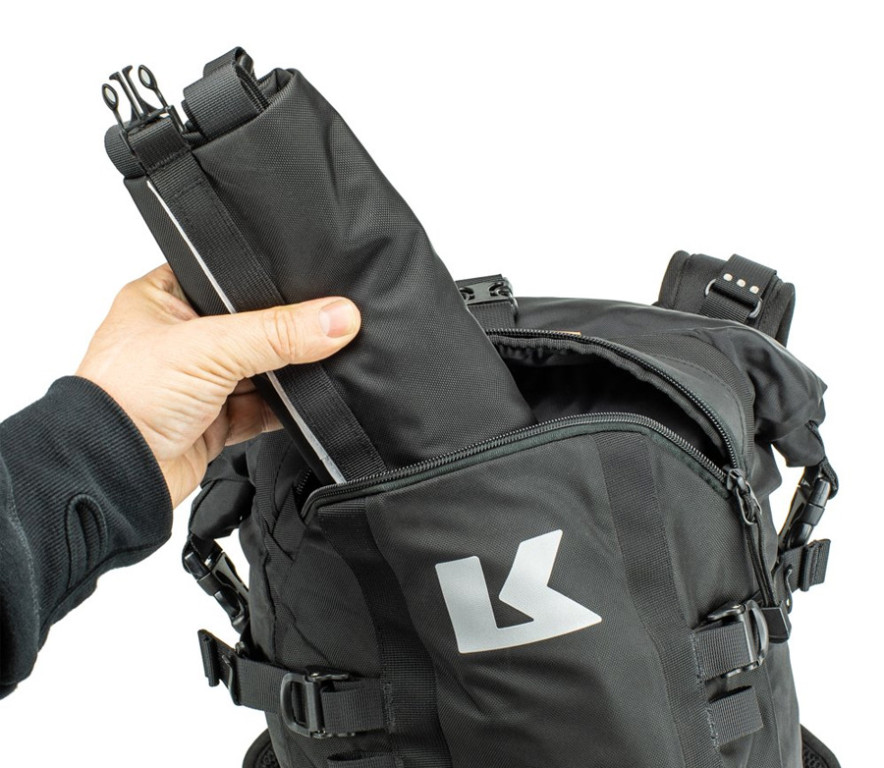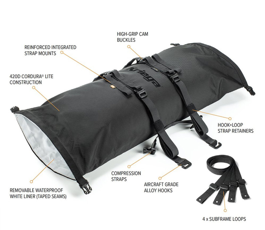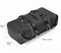 Vnější plášť je vyroben z 420D Cordura® LITE s vnitřní vložkou s podlepenými švy. Rollpack je vyroben tak, aby vydržel nejdrsnější podmínky a poskytoval maximální ochranu vašim uloženým věcem. Oboustranný rolovací uzávěr poskytuje flexibilní voděodolné řešení se snadným přístupem z obou konců. Rollpack je navržen tak, aby se bezpečně vešel na zadní nosič nebo sedadlo spolujezdce a lze jej srolovat a převážet na motorce či v batohu, pokud potřebujete využít další úložný prostor.