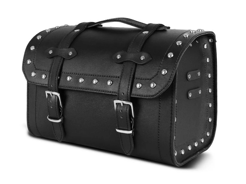 Kufr na motorku s cvoky vyroben z hovězí kůže, tl. 2,8 - 3,2 mm opatřena vodoodpudivým povlakem.