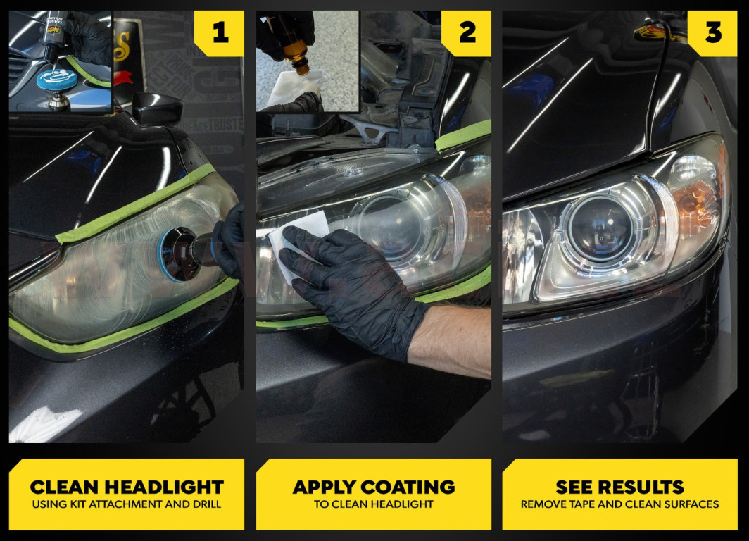 Meguiar's Quik Solutions Headlight Restoration Kit je ideálním řešením pro všechny, kdo chtějí svým zažloutlým a zakaleným světlometům vrátit původní čirost bez nutnosti jejich výměny. Sada kombinuje čisticí roztok, speciální Oxidation Removal Pads a keramickou ochranu s UV blokátory, díky čemuž zvládne renovaci světlometů opravdu každý.