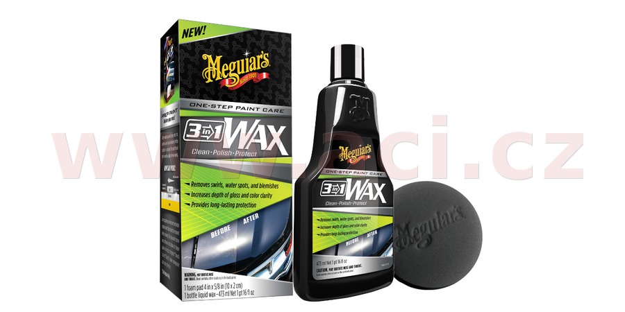 Meguiar's 3-in-1 Wax je voskem, který zbaví váš lak defektů, posílí lesk a dodá odolnou ochranu, a který se velmi snadno aplikuje a ještě snadněji stírá!