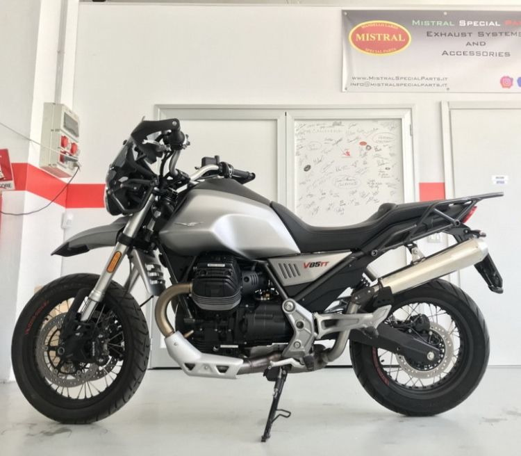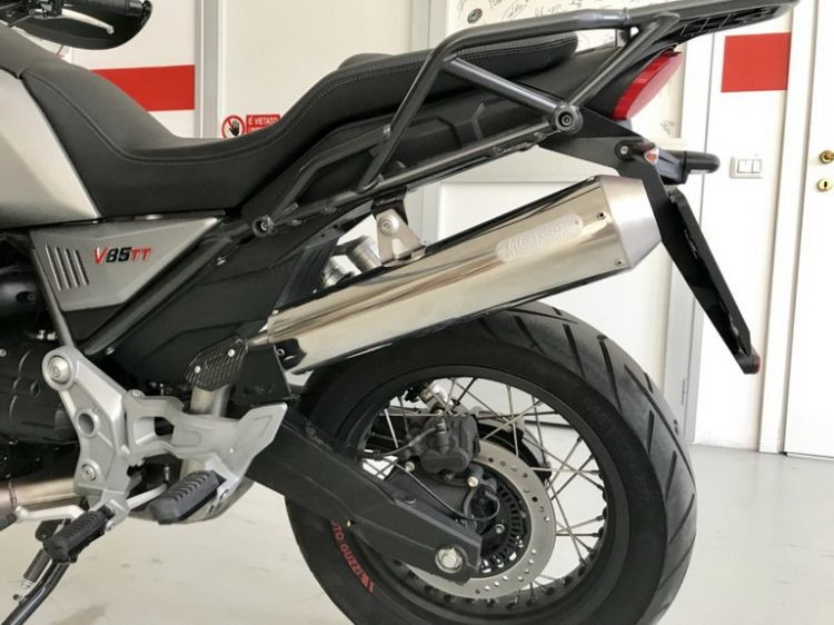 Kónická koncovka výfuku z nerezové oceli vyvinutá speciálně pro MOTO GUZZI V85-TT. Lepší průběh křivky výkonu i točivého momentu v celém rozsahu otáček ve všech rychlostech společně s úsporou hmotnosti!