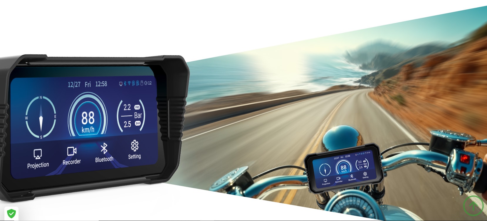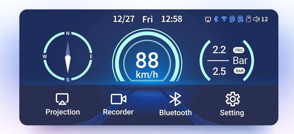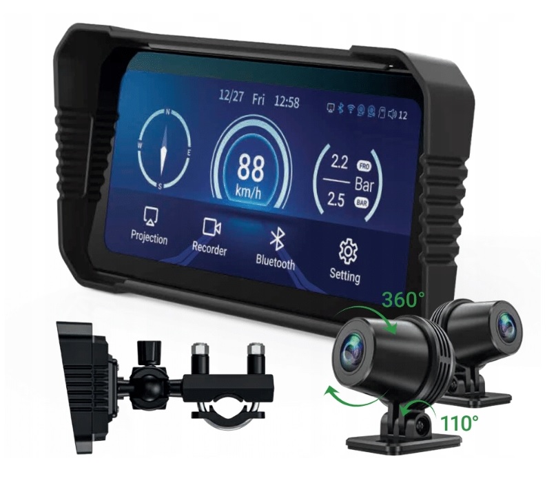 Toto zařízení typu "vše v jednom" kombinuje palubní kameru se dvěma kamerami, digitální rychloměr a kompas. Pomáhá také sledovat tlak a teplotu v pneumatikách a podporuje připojení chytrého telefonu přes Bluetooth/WIFI s CarPlay, Android Auto, AirPlay nebo Mirror Cast. Je navržen pro skutečné podmínky na silnici, je odolný vůči dešti, prachu a stříkající vodě – a funguje bezchybně za každého počasí!