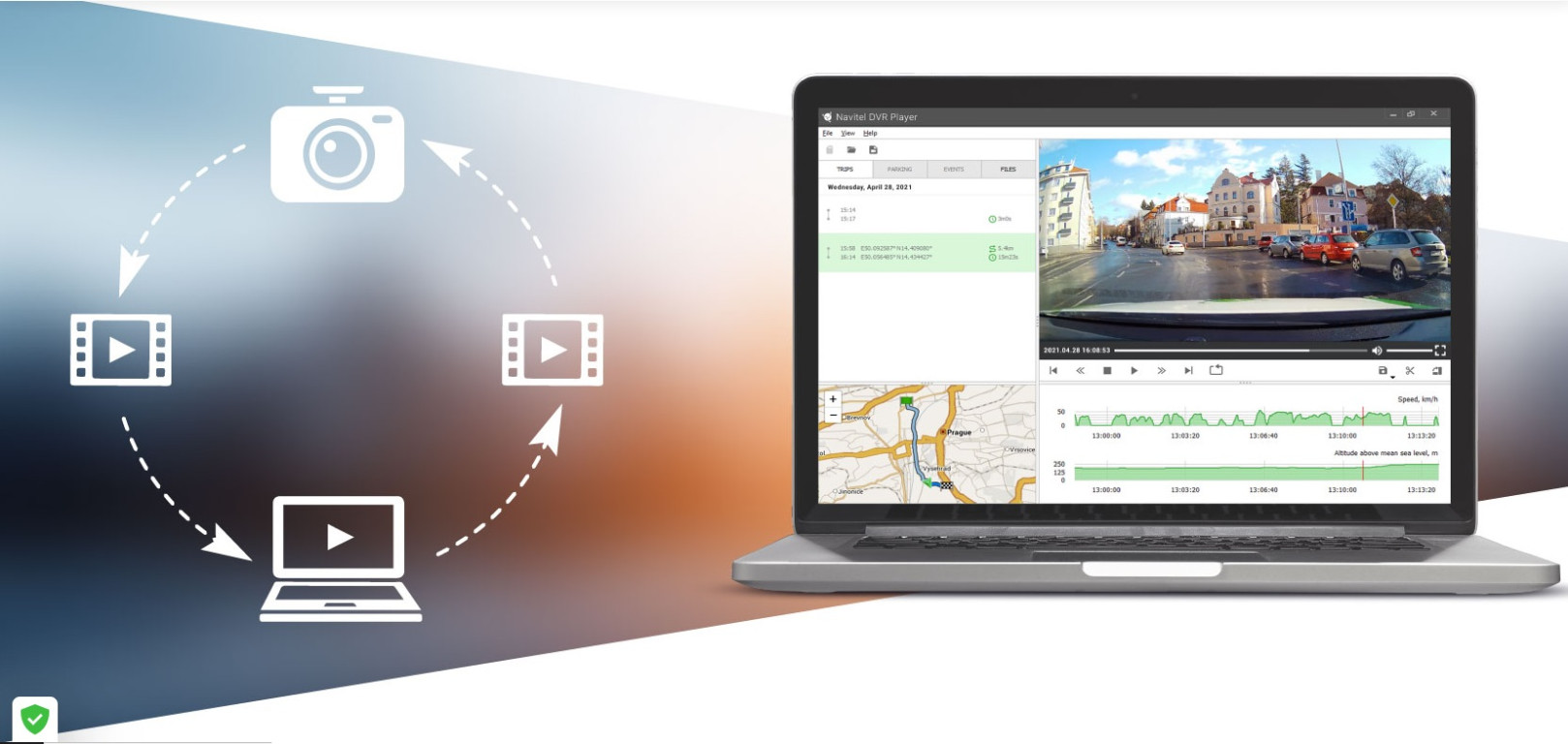 Sledujte, ořezávejte a upravujte nahraná videa na počítači se systémem Windows pomocí přehrávače Navitel DVR Player, který také umožňuje jejich převod do jiných formátů pro lepší kompatibilitu s mobilními zařízeními a sociálními sítěmi. Program má také funkci sledování GPS, která ukazuje, kde se váš motocykl nacházel v každém okamžiku nahraného videa.