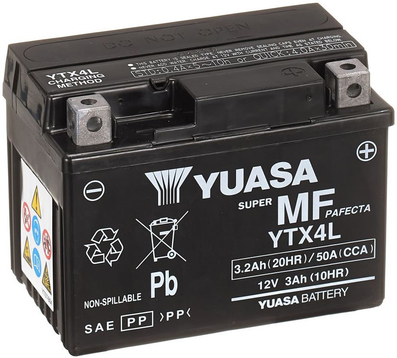 Baterie YUASA MF AGM YTX4L je plně aktivovaná a připravená k okamžitému použití.