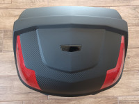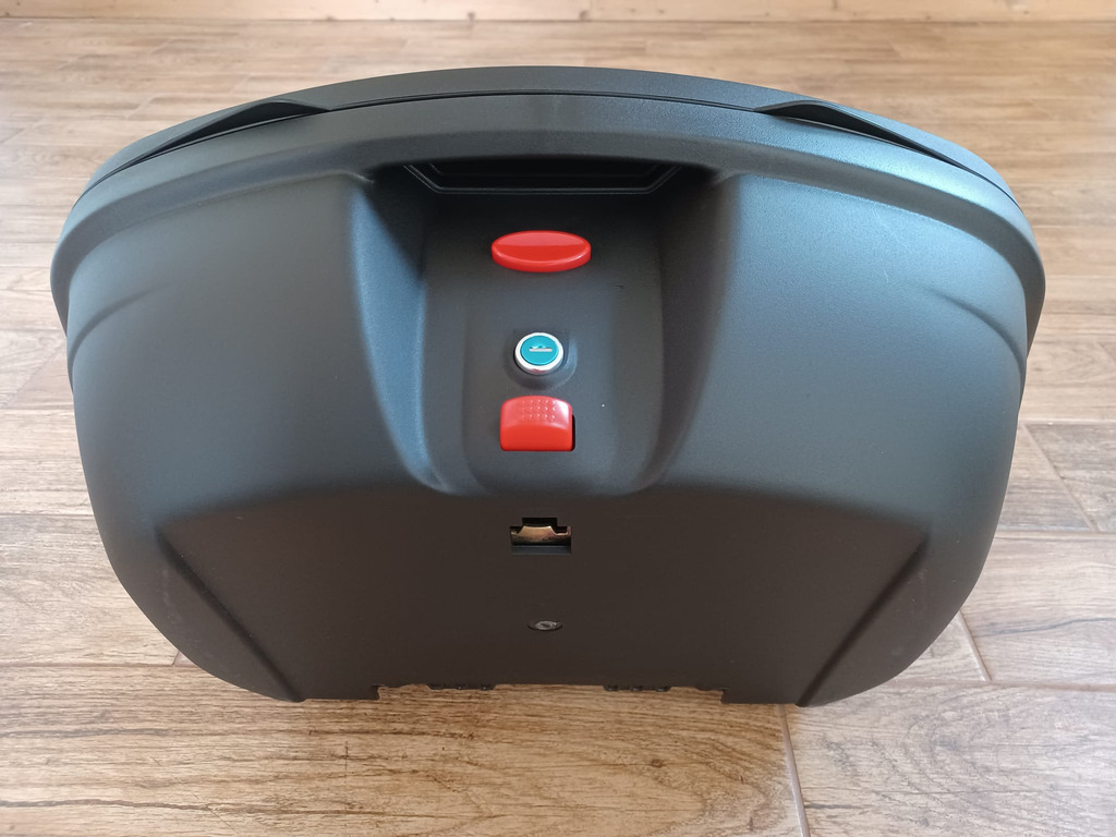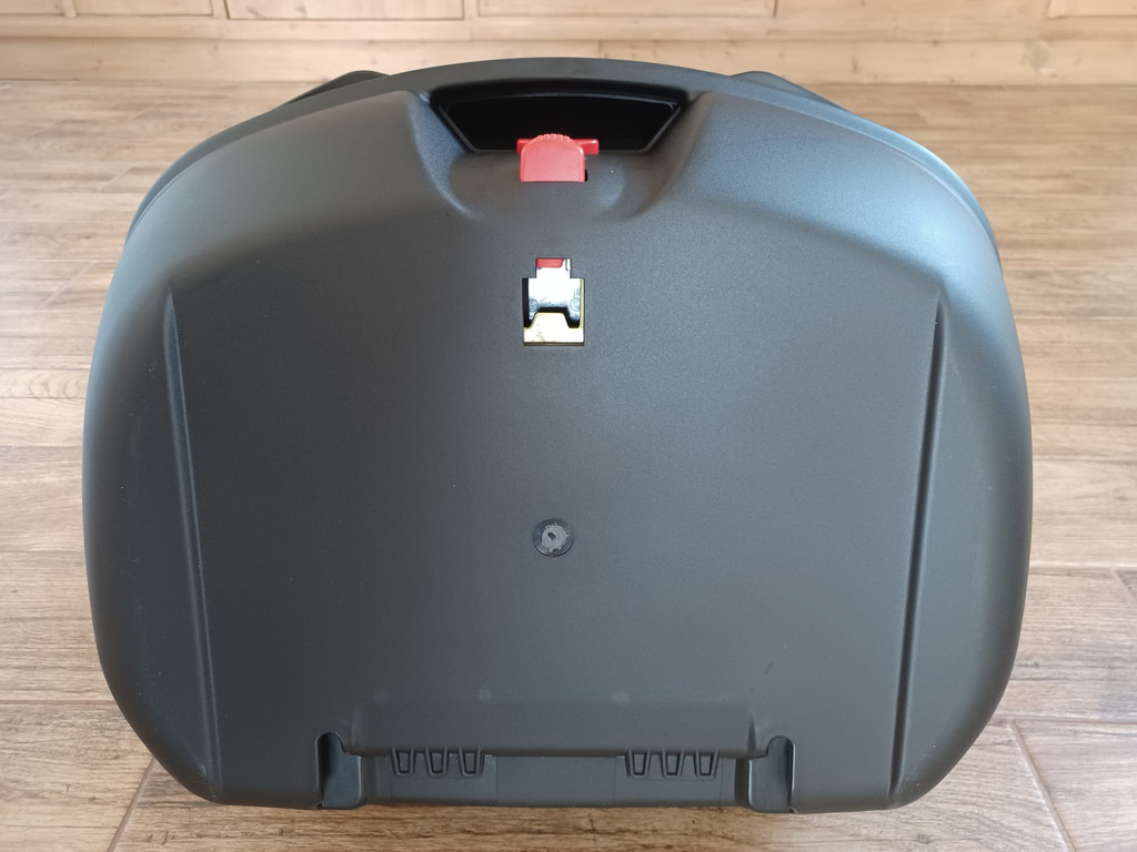 Velký motokufr na 2 přilby s vlastní montážní plotnou typu MONOLOCK, velmi kvalitní provedení, uzamykatelný - inovovaná verze zámku, celoobvodové gumové těsnění proti zatékání vody do kufru, 2x klíček, rozměry: cca 57 x 43 x 32 cm, objem cca 58 l.
