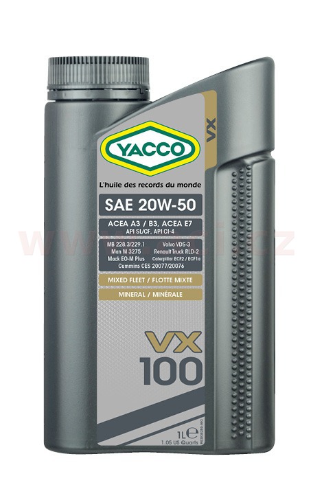 YACCO VX 100 20W50 - Vyvinutý pro vozy turbodmychadly i jiné benzinové či naftové motory používané v různých podmínkách. Poskytuje vynikající mazání a ochranu motorů používaných při vysokých teplotách. Může být použit v motorech s katalyzátorem.