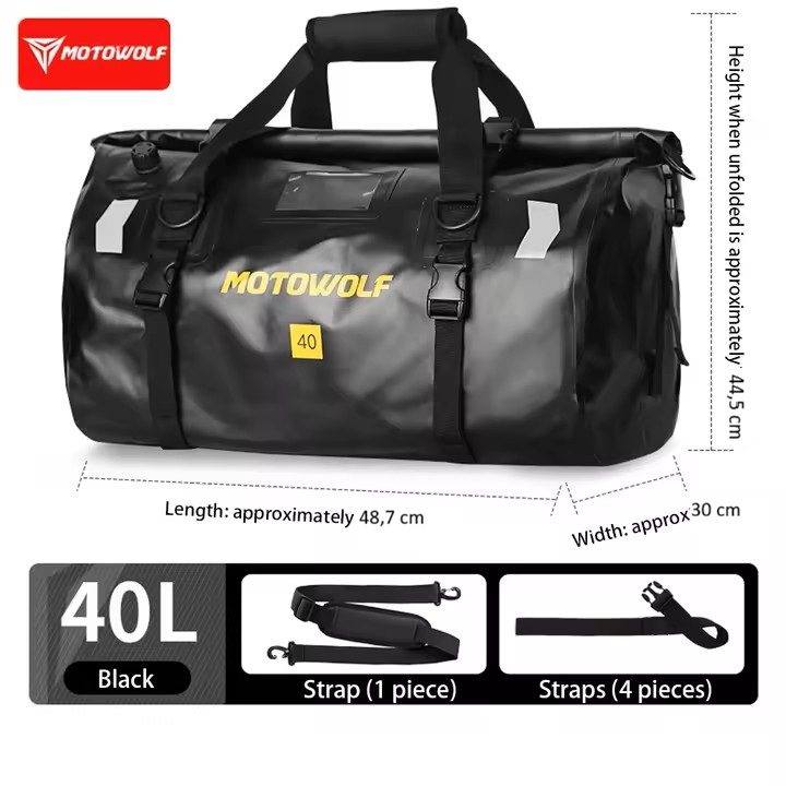 Motovyklová cestovní taška - vak - válec na sedlo. Cestujete a hledáte zavazadlo, které ochrání vaše oblečení v suchu za každého počasí? Cestovní motovak je pro Vás vhodná volba. Je univerzální a pasuje na různé typy motocyklů. Je vyrobena ze speciální voděodolné tkaniny povrstvené PVC impregnací, a proto je vodotěsná a můžete je využít za každého počasí bez obav o uložené věci. Taška je rolovací, otevítání je přes celou šířku vaku, je tedy snadné umístit i rozměrnější předměty. Uchycení k motocyklu je řešeno pomocí popruhů/řemínků. Součástí balení je i popruh přes rameno.