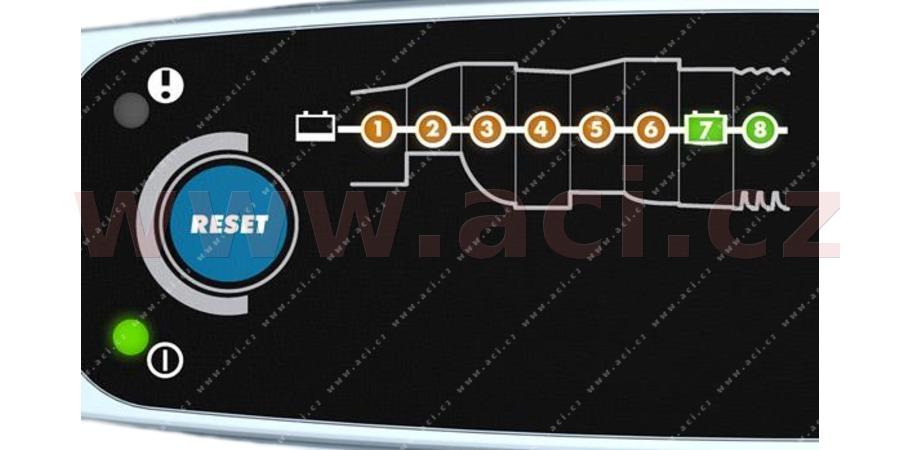 Následně ji zcela bezpečně optimálně nabije. Nabíječku tedy můžete připojit, aniž by jste článek museli odpojovat od vozidla. Nabíjení lze kdykoliv zahájit ručně, pomocí tlačítka "Reset".