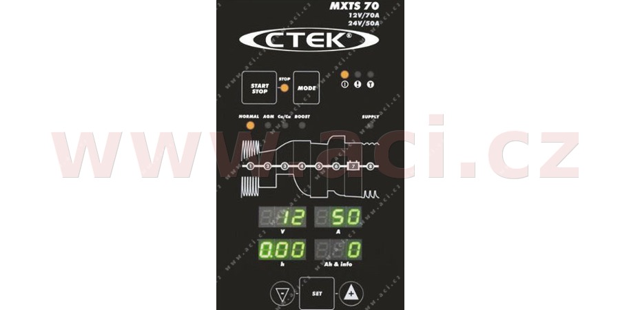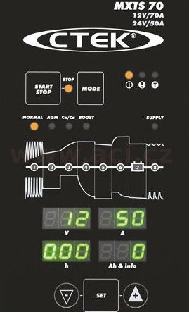 MXTS 70 je velmi výkonnou dílenskou nabíječkou, která používá nejmodernější technologii a u které lze nastavit 70A/12V nebo 35A/24V pro baterie od 40 - 1500 Ah pro 12V a 20 - 750 Ah pro 24V