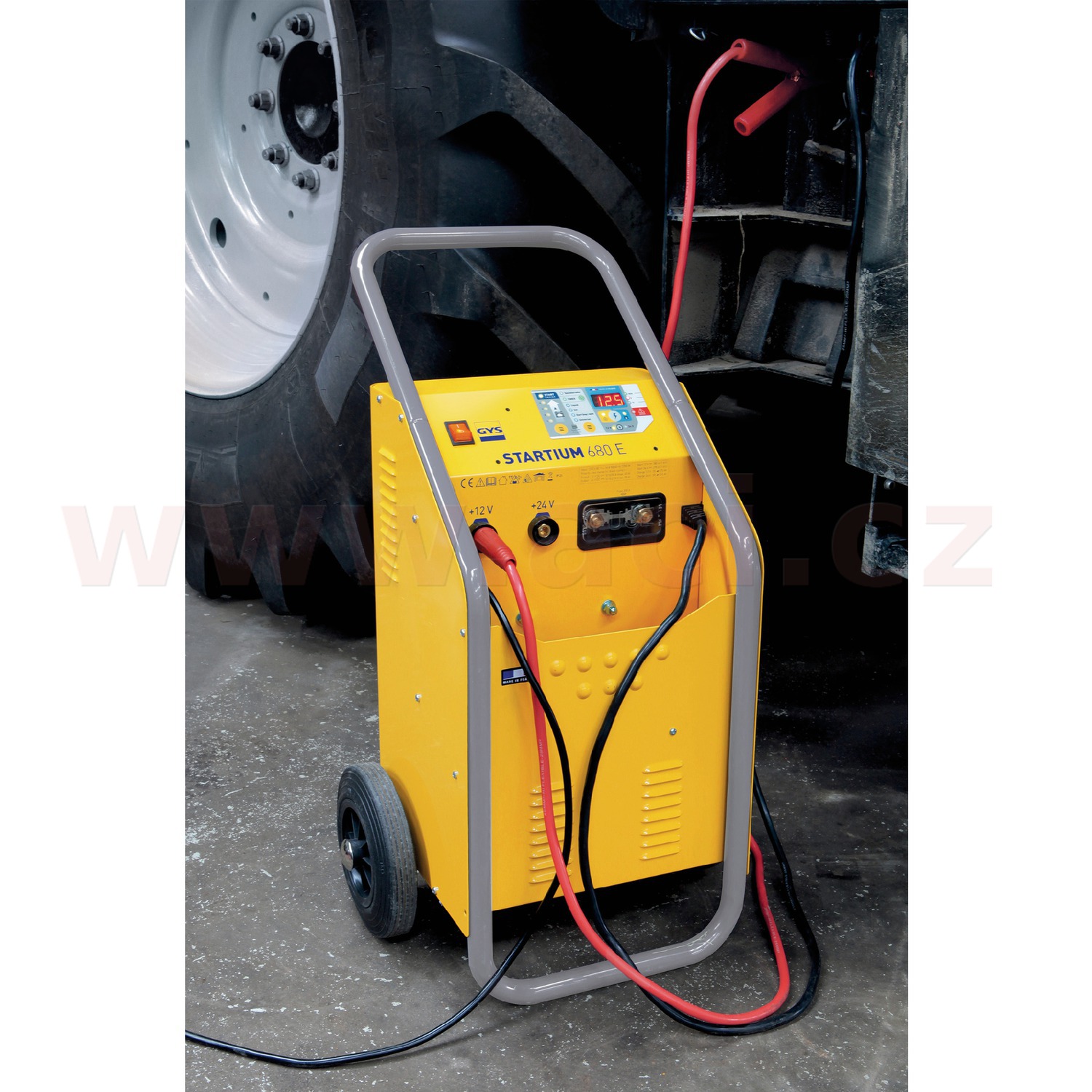 Nabíjecí vozík se startovacím boosterem STARTIUM 680E pro nabíjení a startování vozidel s olověným akumulátorem (tekutý elektrolyt, gel, AGM, Start&Stop, Calcium, VRLA, EFB).