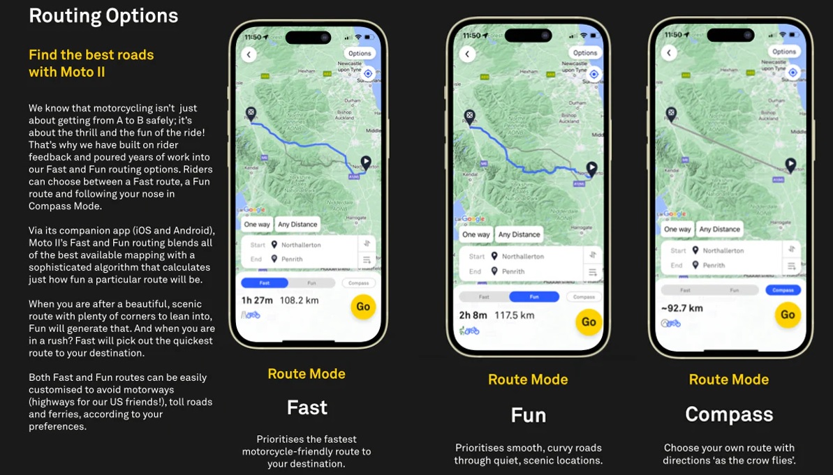 Nová úroveň navigování: Moto II přináší vylepšené „turn-by-turn“ pokyny. Na velkém barevném displeji vidíte nejen šipku, ale i zjednodušený náhled křižovatky (mini-mapu), abyste nikdy neminuli odbočku.