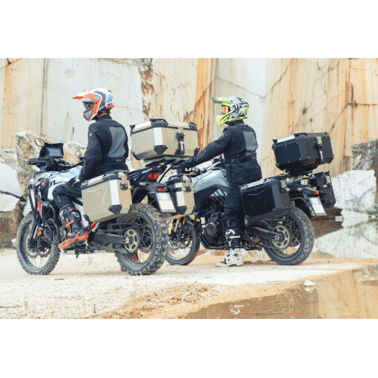GIVI Trekker Outback EVO SMART = KUFR JE DODÁVÁN BEZ ZÁMKU. Kufr horní celohliníkový černě lakovaný s nahoru otevíracím víkem, objem 58 litrů, rozměry šxvxh=586x325x456 mm (z čelního pohledu), nosnost 10 kg, pojme 2 odklápěcí integrální přilby. Uchycení na nosič řady MONOKEY, systém jednoho klíče, bezpečnostní klíč provedení Smart Security Lock SLR. Ideální pro kombinaci s bočními kufry OBKEV37B nebo OBKEV48B. K dispozici od 07/2024. Provedení Outback EVO. K dispozici od roku 2024, dodáván bez zámku. Zámek k dokoupení SLR101 (jeden zámek), SLR102 (sada stejných 2 zámků), SLR103 (sada 3 stejných zámků), SLR105 (sada 5 stejných zámků). Tyto nové zámky lze snadno vyměnit a nabízí nově možnost otevírat víko kufru bez klíče zastrčeného v zámku. NOvě jsou k dispozici 4 polohy klíče: Trojúhelník = nasazení vložky s klíčem do kufru. Kroužek = zamčené víko, kufr nelze sundat, klíč lze vytáhnout. I = otevření víka bez klíče, kufr nelze sundat, klíč lze vytáhnout. II = víko lze otevřít, kufr lze sundat, klíč nelze vytáhnout.