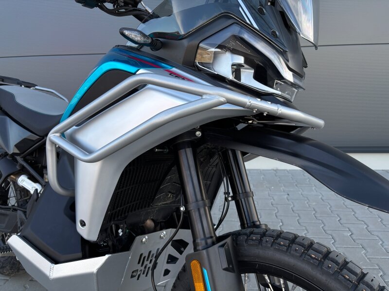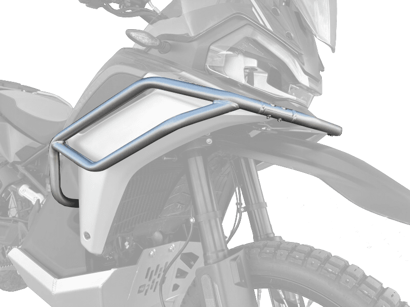 Sada horních padacích rámů chránících kapotáž motocyklu 800MT‑X z nabídky originálního příslušenství CFMOTO. Pro maximální ochranu stroje doporučujeme dokoupit spodní padací rámy nebo kryt motoru (nelze obojí).