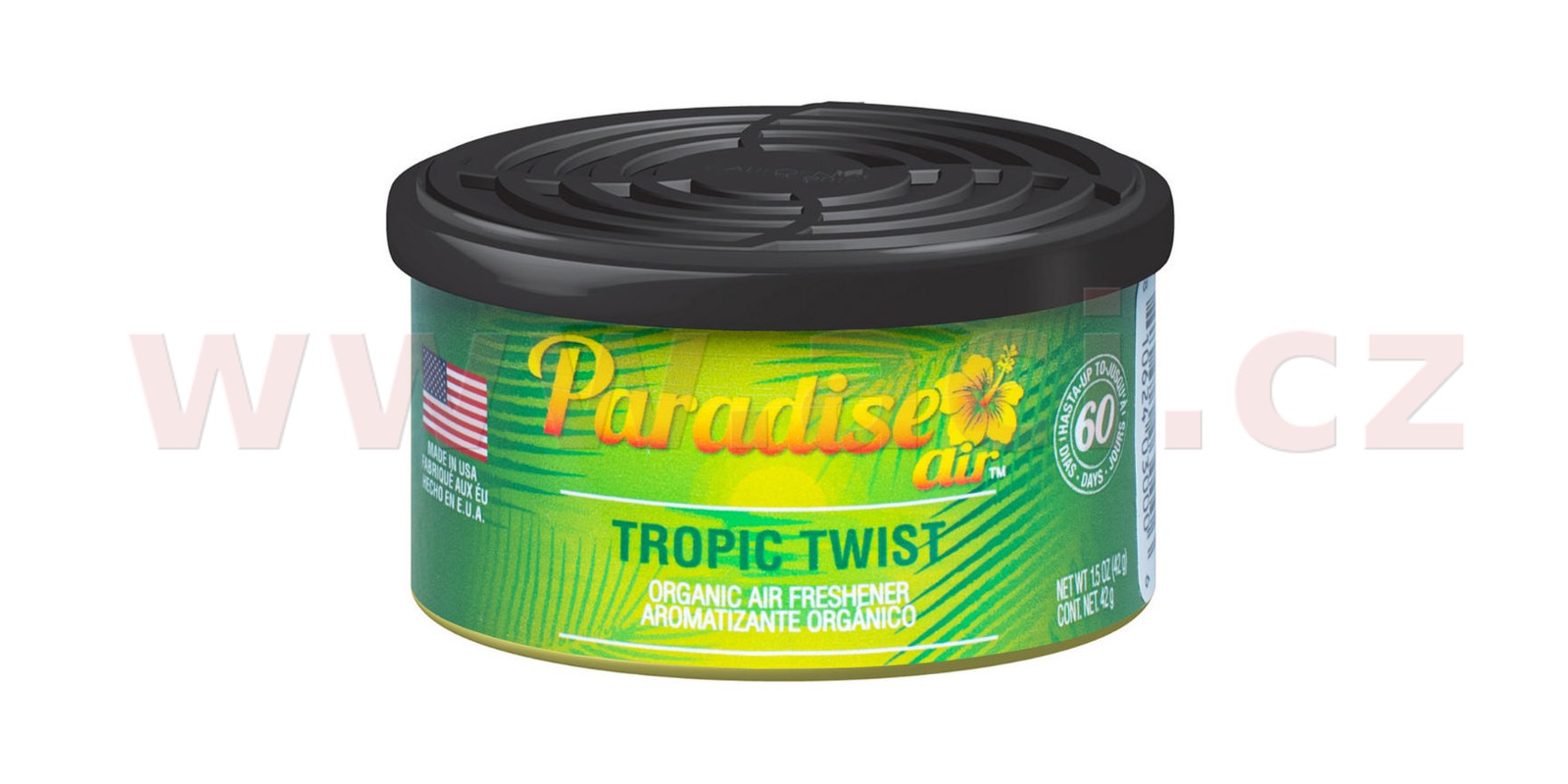 Každá plechovka vůně Paradise Air Organic obsahuje tři bloky lisovaného lnu napuštěného parfémem. Vzhledem k pevné konzistenci osvěžovače Paradise Air také nehrozí – jako u obdobných produktů tvořených nádobkou s parfémem – únik tekutiny následovaný nepříjemným poleptáním interiérových plastů automobilu.